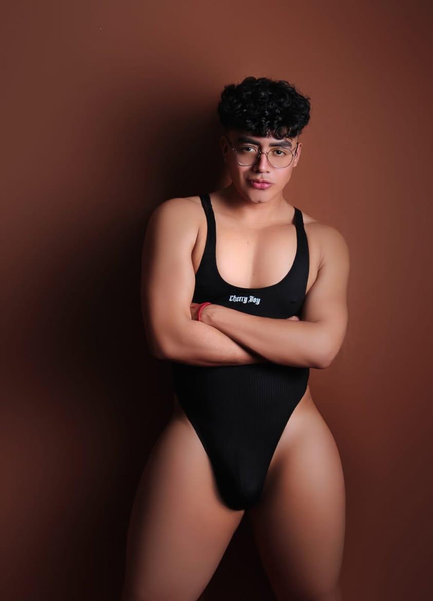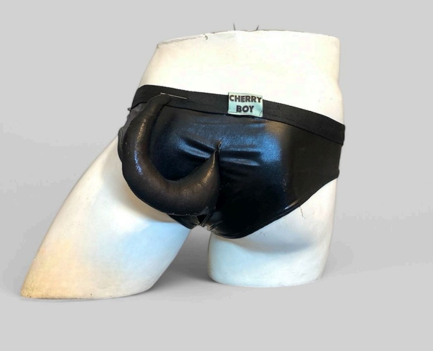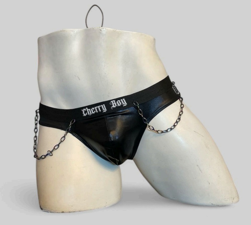Brief hecho a base de likra metálica en color negro, con cola de perrito, y cadenas tornasol como decoración.